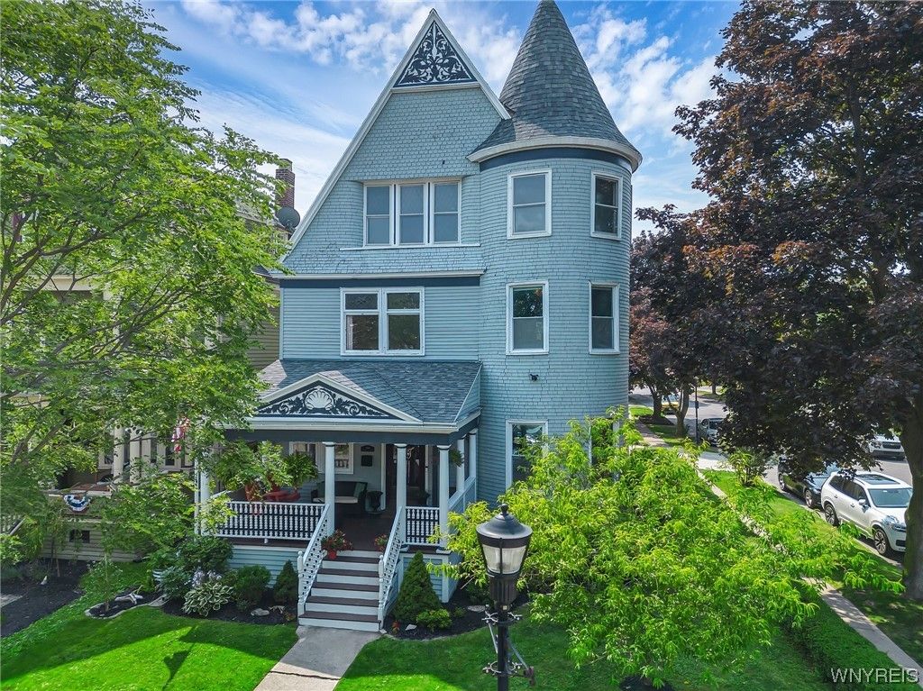 Welcome to the character and majesty of 134 Claremont! A rare opportunity to own a remarkable turn of the century Queen Anne Victorian, w/ 3100+ ft², steps from the culture & convenience of the Elmwood Village. This architectural masterpiece has been meticulously maintained & updated. You are greeted by a stately entry foyer & grand staircase, adorned w/ natural woodwork & gleaming HW floors. Renovated kitchen ('19) features granite counters, tile backsplash, custom cabinetry, recessed lighting, SS appliances & opened to a formal din rm w/ original wainscoting. Double liv rm along w/ an add'l room which can be used as a den/study, bonus, or even potential 1st fl bdr. 2nd floor has a gorgeous landing, full bath, and 4 bdrs, including a large primary w/ walk-in closet. Exterior boasts a large, covered front porch; concrete drive for 2+ cars ('18); freshly painted siding; impeccable landscaping, & fully-fenced yard. All but the ornate, leaded & stained glass windows have been replaced w/ vinyl. Other updates include: drain tile/sump '22, repointed chimney '22, fence '18, electric service '17. Open house Wed, Aug 2: 5-7p & Sat, Aug 5: 11a-1p. Offers reviewed Tues, Aug 8 at 2p.