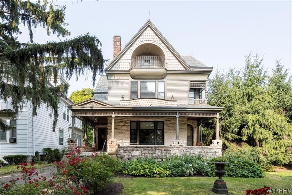 Stunning architectural details define this handsome Victorian that is situated on a double lot in the Elmwood Village. The home was designed by the architect H.H. Little for his personal residence. The entry vestibule, foyer, and staircase have been restored to its original grandeur. The first floor features stained glass windows, intricate natural woodwork, gorgeous wood flooring, original tile fireplace, pocket doors, and coffered ceilings. The first floor has a spacious living room, formal dining room, study, and kitchen with breakfast room. There are three bedrooms, a laundry room, and two bathrooms on the second floor. The primary bedroom has an adjoining dressing room and full bathroom. The second full bathroom is located off the hallway and was renovated two years ago. The finished third floor has a third full bathroom and several rooms, offering many possibilities. There is a wonderful, private back yard courtyard and an extra full lot to the side of the house. The detached garage can fit two cars plus a smaller car.