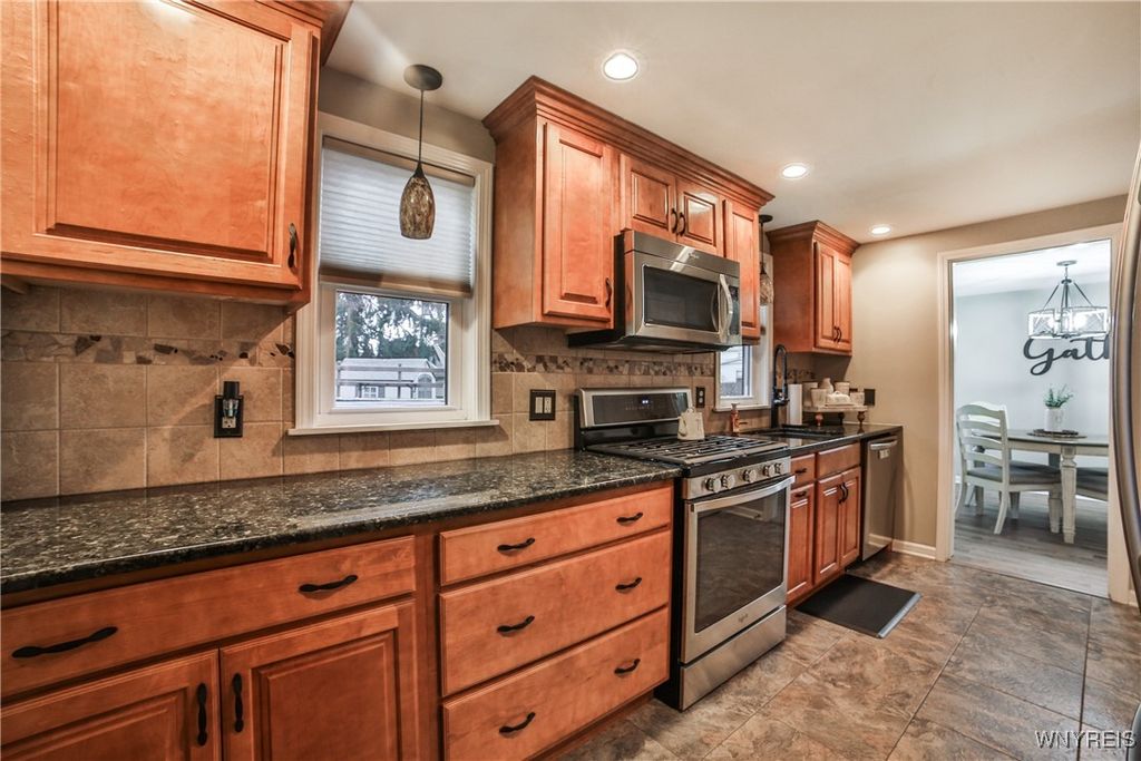 Move right into this well-maintained 3-bedroom, 1-bath home, conveniently located close to parks, shopping, and the Thruway. The updated kitchen features granite countertops and appliances and overlooks the fully fenced yard with an above-ground pool. A bright, welcoming living room offers a bow window, and a large entryway nook adds extra space and functionality. The dining room includes sliders leading to the deck. Upstairs you'll find three generously sized bedrooms and a full bath. Additional highlights include updated windows (2018), a full dry basement with ample storage, a roof replaced in 2022, a concrete patio, and a one-car detached garage.