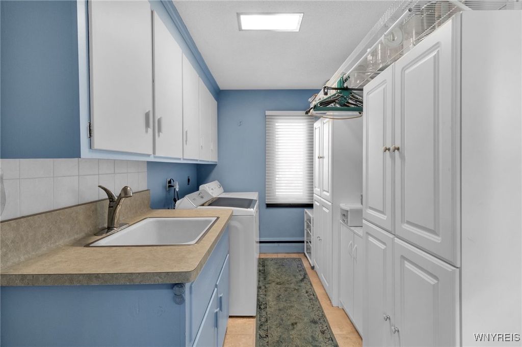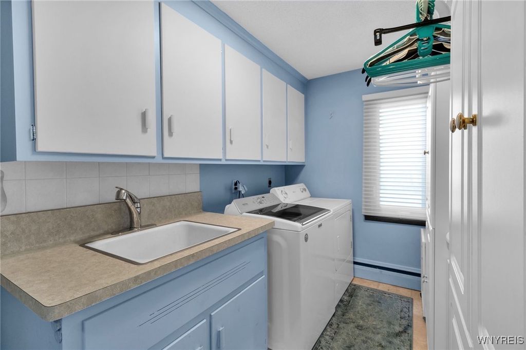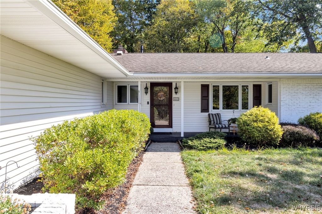 Experience the perfect balance of simplicity, space, and serenity in this sprawling Scandinavian-inspired ranch, set on over 2/3 acre in the sought-after Pineledge neighborhood near Spaulding Lake and within the Ledgeview Elementary district. Offering 3 bedrooms, 2.5 baths, a 2.5-car attached garage, an additional 1.5-car detached garage/shed, and a true zero-step interior layout, this home is designed for comfort and convenience. The exterior is graced with whitewashed brick frontage, new vinyl siding, updated gutters with gutter guards, architectural shingled roof, deep covered porch, and a Generac gas-powered backup generator. Inside, light-filled spaces feature six picture windows, Hunter Douglas translucent window shades, and a flowing floor plan that blends form and function. A generous living room with built-in bookshelves opens to a large eat-in kitchen with high end laminate counters, tile backsplash, breakfast bar, surround sound speakers, and access to a side patio for outdoor dining. The formal dining room and family room are anchored by a dual-sided marble gas/wood-burning fireplace and picture windows framing tranquil wooded views. The first-floor laundry includes added cabinetry, and the entry is finished with tile flooring. Bedrooms are spacious and versatile, including one with built-in shelving perfect as a home office. Both full baths showcase charming mid-century modern finishes with mosaic counters and wood accents. Enjoy additional conveniences such as ceiling fans in kitchen and bedrooms, remote-controlled alarm system, updated garage doors with new rollers/springs, freshly landscaped grounds, large rear concrete patio, and blacktop driveway with apron for extra parking. Mechanicals include a state-of-the-art Viessmann high-efficiency combination boiler and water heater (2024), ceiling-mounted central air, replaced windows throughout, and storage throughout the home and garage. If you've been searching for a rare ranch that combines design, comfort, and privacy in a premier Clarence location"”welcome home to 4883 Winding Ln!