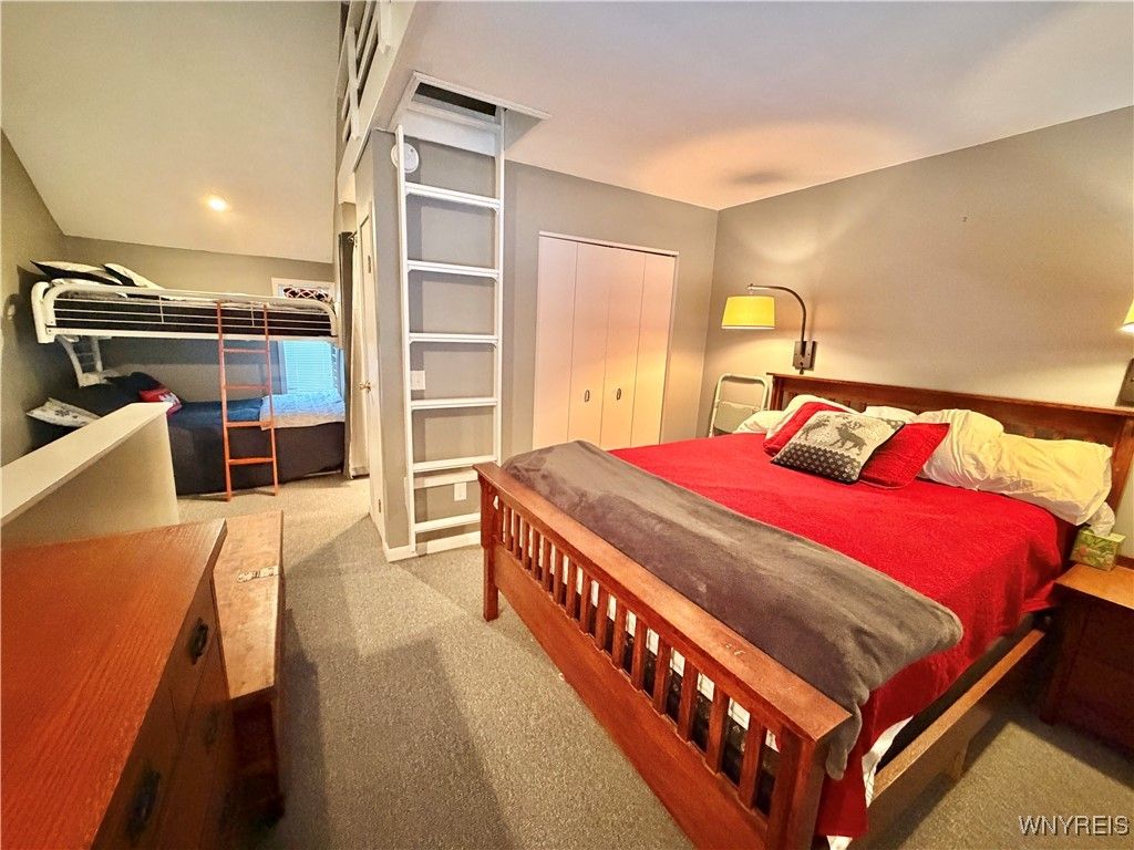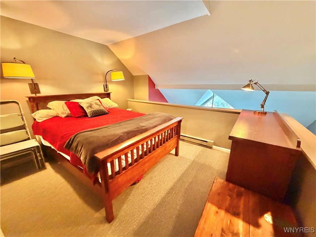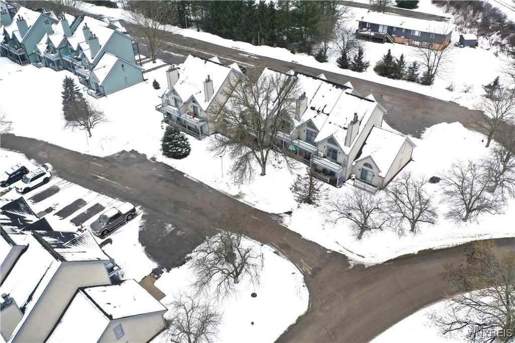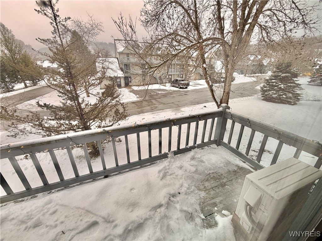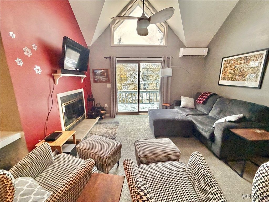 Ideally located close to the ski slopes and just minutes from the Village of Ellicottville, this well-maintained Wildflower townhouse offers slope views of Sunrise both day and night and is within easy walking distance to two popular restaurants and bars. The attractive interior features thoughtful upgrades designed for comfortable four-season living. The main level includes an upgraded half bath, a welcoming foyer with dedicated ski storage, and a remodeled kitchen with newer upgraded appliances and striking countertops. The kitchen opens to an eat-at bar and flows seamlessly into the dining and living areas, making the layout ideal for entertaining. A wood-burning fireplace adds warmth and character after a day on the slopes, while sliding glass doors lead to the deck and overlook the ski runs. Upstairs, the primary bedroom, updated full bath, and washer/dryer closet are complemented by an extended loft providing additional sleeping space, including built-in bunk beds. A finished bonus area above the bedroom closet offers flexible use for storage, a reading nook, or additional living space. Additional upgrades include a mini-split system for efficient air conditioning and supplemental heat, helping to keep utility costs low. Offered fully furnished for easy, turn-key ownership. Holiday Valley shuttle service provides convenient pickup within the Wildflower community. HOA dues include cable TV and Wi-Fi. Move-in ready and available to enjoy for the remainder of the ski season and beyond.