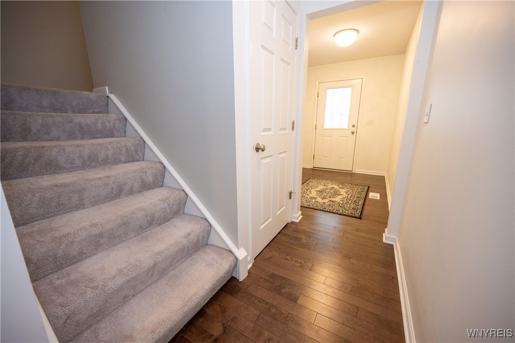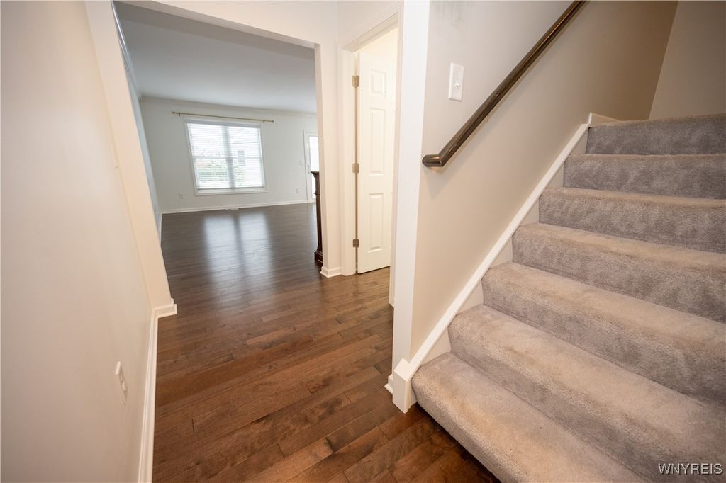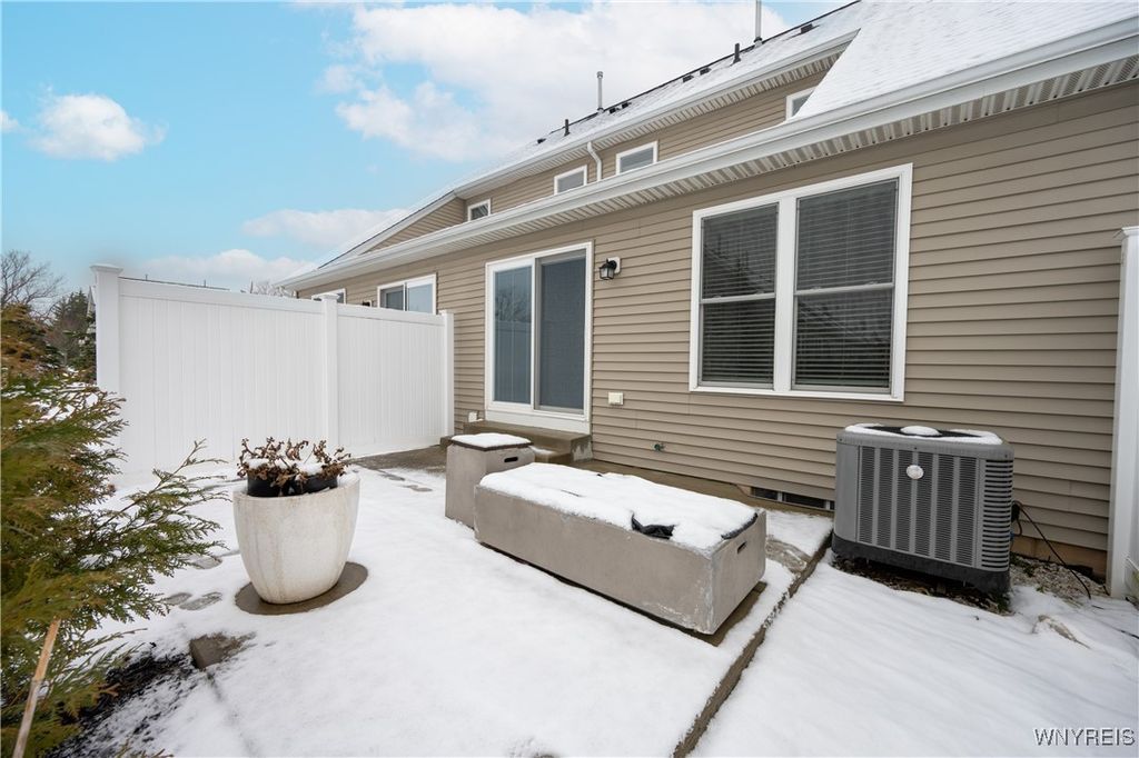 Experience refined living in this exquisite Marrano-built 2-bedroom, 1.5-bath townhome nestled within the sought-after Central Villas private community in the Town of Lancaster. Thoughtfully designed with upscale finishes and a spacious, flowing layout, this residence offers timeless elegance paired with modern comfort. A gracious formal entryway sets the tone, opening to a sun-filled living room and formal dining room adorned with elegant trim work and rich hardwood floors that extend seamlessly throughout the main living areas. Sliding glass doors from the dining room lead to a private outdoor retreat featuring a concrete patio and firepit"”an ideal setting for intimate gatherings or peaceful evenings. The kitchen offers abundant cabinetry and counter space, recessed lighting, and effortless functionality. A first-floor laundry area adds everyday convenience, while a sophisticated half bath stuns with a pedestal sink and designer gold hardware accents. Upstairs, two generously proportioned bedrooms offer tranquility and comfort, both appointed with custom-made blinds. The primary suite features a walk-in closet, while the beautifully appointed full bathroom functions as an en-suite and connects to both bedrooms for seamless access. The fully finished, dry basement is a true showpiece"”expanding your living and entertaining space with luxury vinyl flooring, a custom dry bar featuring shaker-style cabinetry, quartz countertops, beverage chiller, wine storage, and a stunning stacked-stone surround framing the fireplace to create a warm and inviting focal point. Designer lighting, exceptional storage throughout, and quality craftsmanship are evident at every turn. Outdoors, enjoy a one-car attached garage, covered front porch, and manicured landscaping. Affordable HOA fees provide true maintenance-free living, including a pool, lawn care, snow removal, and more. Turn-key, sophisticated, and impeccably maintained"”this home is a rare offering. Showings are encouraged, and offers will be considered as received. Open House: January 3rd | 11:00 AM - 1:00 PM