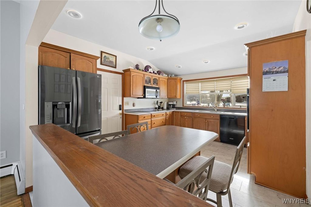 Wrapped in a fresh blanket of snow, this FANTASTIC 3-bedroom, 2.5-bath ranch located in the sought-after Village of Hamburg offers over 1,800 square feet of thoughtfully designed living space. Enter through the welcoming center foyer with generous closet, leading to a spacious living room/dining room combination featuring a cozy stone-walled gas fireplace, vaulted ceilings, a large picture window, and hardwood floors lending an inviting, open atmosphere. The dining room opens through sliding glass doors to a beautiful pie-shaped backyard with a stamped concrete patio, mature trees, privacy fencing, and a park-like setting"”perfect for entertaining, gatherings, or quiet evenings outdoors. A storage shed provides added convenience. Inside, the newly updated (2022), fully-equipped kitchen showcases a KitchenAid convection oven, abundant cabinetry and counter space, a comfortable eat-in area, and direct interior access to the attached two-car garage. Up a few steps from the foyer are two generously sized bedrooms, a full bath, and a spacious primary bedroom suite with double closets. All bedrooms feature hardwood floors and excellent closet space. Additional living space awaits in the basement with an impressive 24' x 20' finished recreation room, complete with glass block windows and a convenient half bath"”ideal for a media room, game days, playroom, or home retreat. Laundry and ample storage space are located in a separate utility area. Additional highlights include some newer windows and major MECHANICAL UPDATES: 2024 boiler with three zones, 2024 hot water tank, and newer roof (2021). So much to offer"”move right in and enjoy spring in this wonderful home! Conveniently located near restaurants, coffee shops, and shopping, with easy access to the I-90 via Camp Road. Any and all offers are due by 12:00 on Tuesday, February 10th. Open House on Saturday, February 7th from 11am - 1pm.