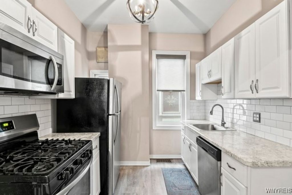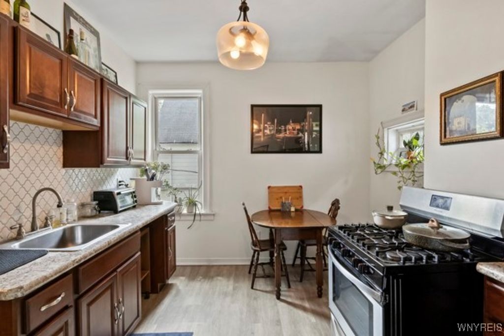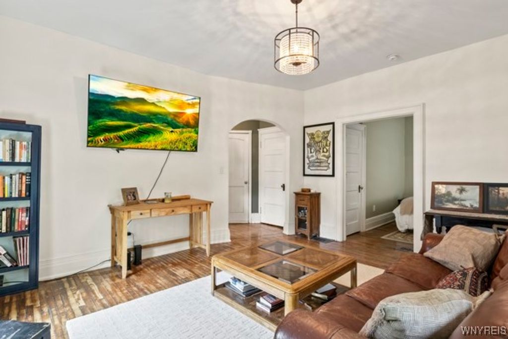 Welcome to a timeless Elmwood Village three unit located on the corner of West Utica Street and Norwood Avenue near Five Points, Elmwood Village, Allentown, and downtown Buffalo. This classic old money style home offers three luxurious units filled with gorgeous hardwood floors, rich dark natural woodwork, and tons of natural light throughout. All appliances are included, and the property has been thoughtfully maintained with recent improvements including fresh exterior paint, a new driveway, and a new walkway, along with fresh updates inside the tenant units before move in. The lower unit is a spacious three bedroom one bathroom apartment featuring grand living spaces, beautiful hardwood floors, a wonderful bathroom, and convenient in unit laundry hookups, plus a huge covered front porch that adds the perfect outdoor living space for relaxing or entertaining. Rent for the lower unit is $1,900 per month and the landlord pays gas and water. Upstairs are two back to back one bedroom units, both currently rented for $1,200 per month each, with the landlord also paying gas and water. The upper front unit features a bright front bedroom with beautiful windows and access to a private balcony, while the upper rear unit offers a large eat in kitchen with hardwood floors continuing through the living room and bedroom. Additional highlights include a corner lot setting with a three car driveway, a two car garage, a huge full walk up attic, and a full basement with shared coin operated laundry for tenants.
