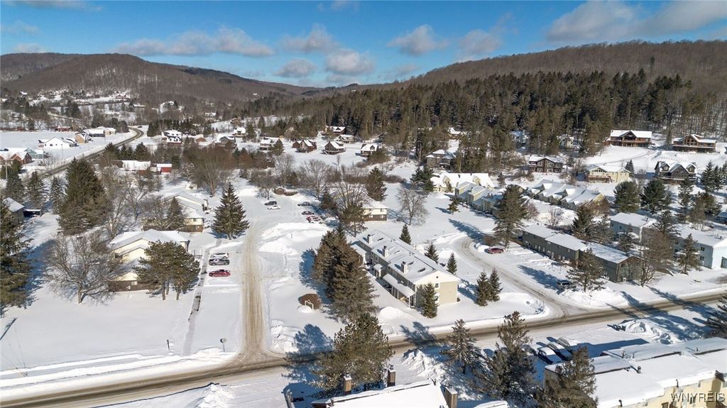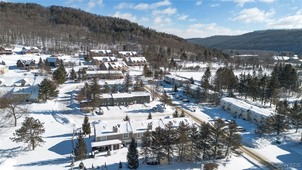 Walk to the heart of Ellicottville from this well-located townhouse, offering true ski-town convenience and low-maintenance living. The village park, the library, dining, and shopping are just steps away, making this an ideal year-round or weekend residence. A welcoming entry mudroom provides an ideal transition space for ski gear and everyday essentials, making arrivals effortless in every season. From there, the two-story layout opens to a dramatic living room with vaulted ceilings, a wood-burning stone fireplace, and direct access to a private rear patio. The kitchen offers generous cabinetry with well-appointed bar seating, well suited for both daily living and entertaining. Upstairs, the primary bedroom is joined by two additional bedrooms, a full bath, and a bonus loft area with ladder access. A conveniently located washer and dryer on the upper level enhances functionality. Additional amenities include a private storage unit, shared firepit area, and access to a community snowblower. The self-managed association provides lawn care, snow removal, and garbage collection for $150 per month. One of only six individually designed units, this property presents a rare opportunity for true walk-to-everything village living. Square footage is approximate and based on agent measurements; buyers to verify.