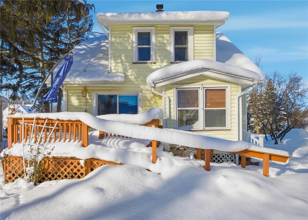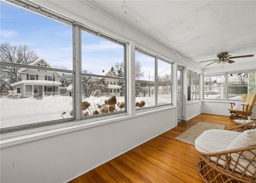 Charming 3-bedroom Cape Cod located in the Village of Webster, just minutes from Ridge Road and nearby shops, dining, and services. This home offers a comfortable layout with clear separation between living and sleeping areas and a welcoming feel throughout. The enclosed front porch and living room feature newly refinished hardwood floors, paired with original chestnut trim throughout the first floor, creating a warm and inviting main living space. A custom shiplap-style accent wall crafted from knotty pine adds visual interest and a cozy focal point. The eat-in country kitchen opens to everyday living space, while all three bedrooms are located on the second floor, including two bedrooms with new carpet. Hardwood flooring is present beneath the carpeting upstairs (condition unknown). Key mechanical updates include: Newer Gas furnace (2018) and Tankless water heater (2019) Additional features include a full basement, detached one-car garage, rear deck, and location within the Webster School District. Set on a 0.25-acre lot on a neighborhood street, this property offers a convenient village location with access to everyday amenities and major routes. A solid opportunity for an owner-occupant or investor. *****Ceiling Fan in Family Room has been replaced since photos were taken****** DELAYED NEGOTIATIONS TUESDAY FEBRUARY 10th AT 12PM