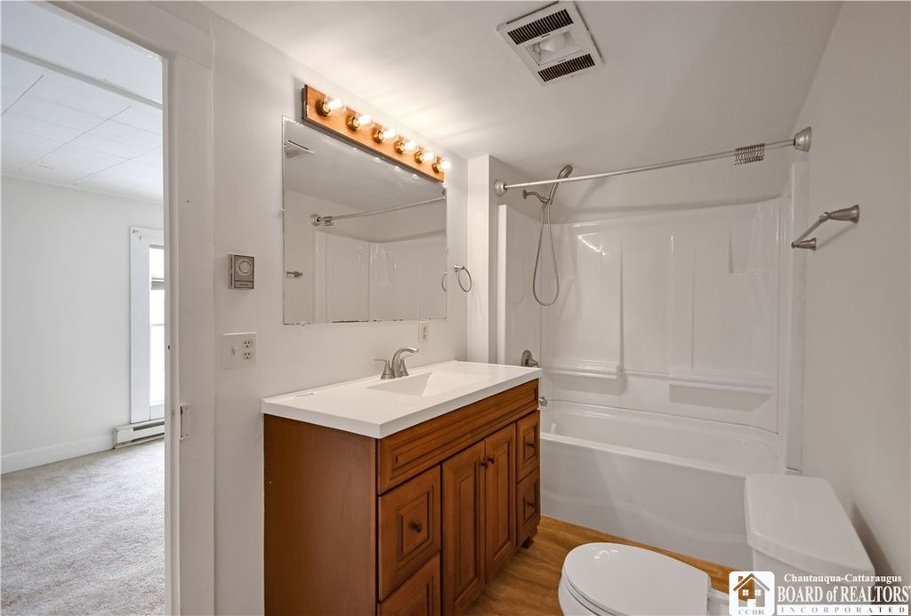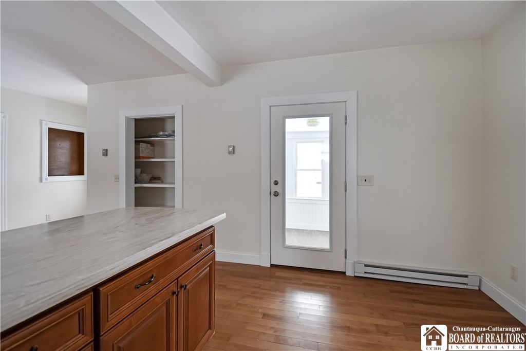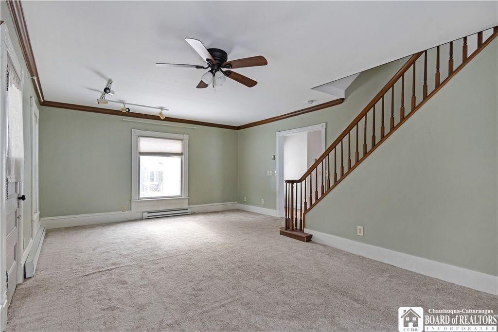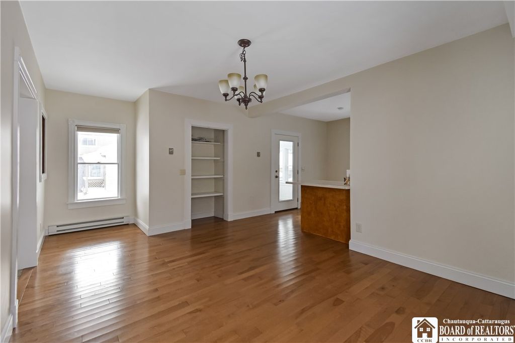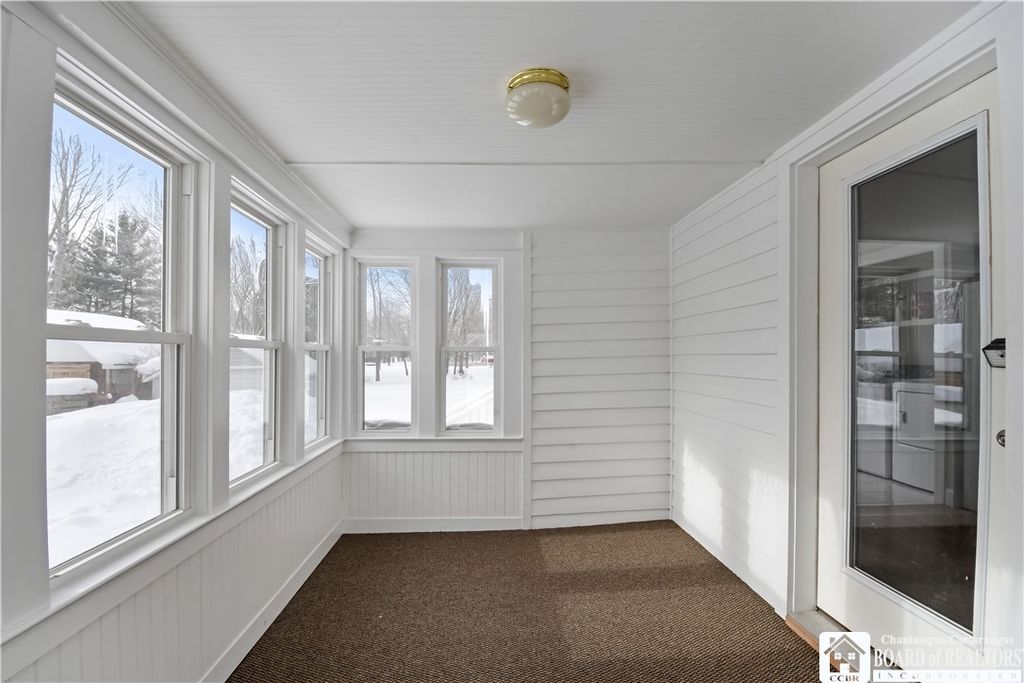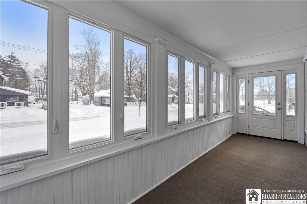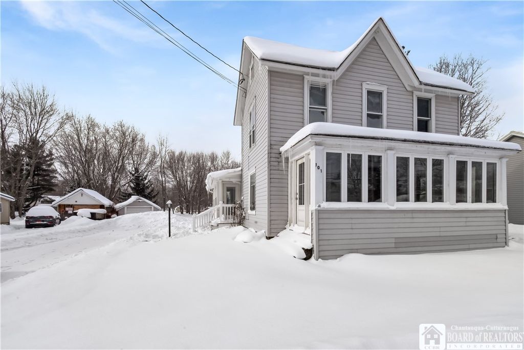 Single-family rental home with 3 bedrooms and 2 full baths. The kitchen is fully equipped with a stove/oven, dishwasher, microwave, and refrigerator, with hardwood floors in the kitchen and dining area. There's a large dining room and a huge living room, offering plenty of space. The home features two enclosed porches"”a front porch that works well as a three-season room and a side porch near the driveway. Both have updated windows, bringing in lots of natural light and helping with efficiency. A laundry area with a washer and dryer is included, along with a basement for additional storage. Outside, the driveway fits multiple vehicles, there's a small garage for storage, and a large back deck overlooking a spacious yard. Conveniently located about 0.1 mile from the neighborhood park and approximately 0.25 mile from Chautauqua Lake.