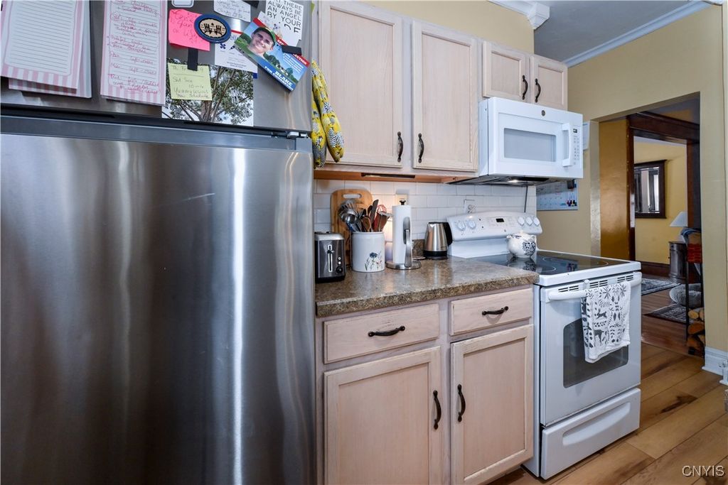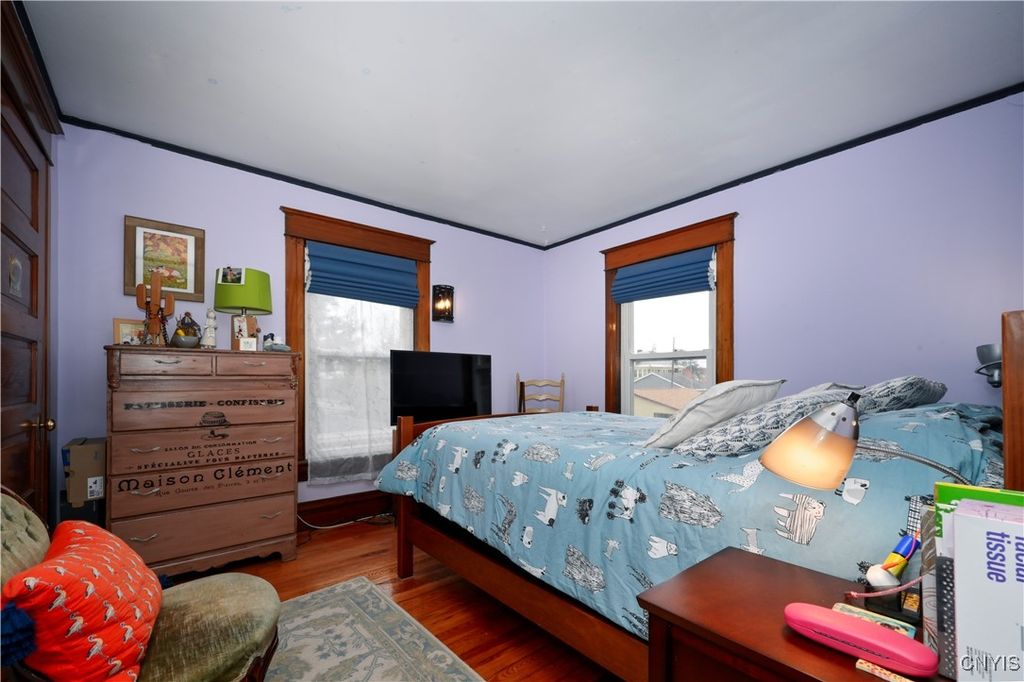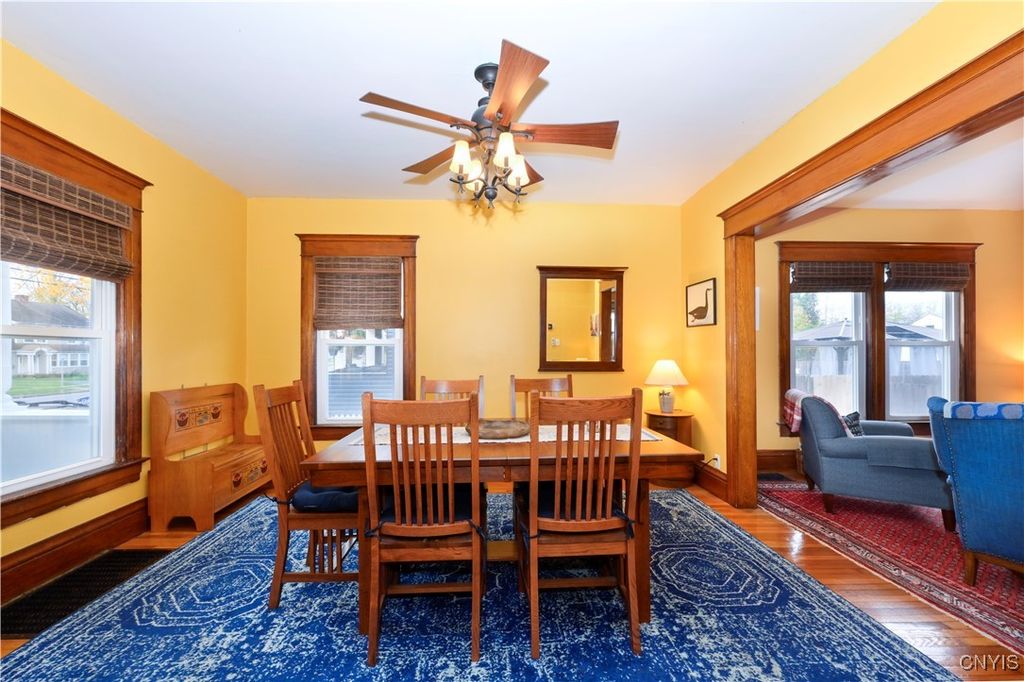 This beautifully maintained and charming 1900s home is situated in a picturesque neighborhood, conveniently located near shopping, play grounds and business establishments. A beautiful glass door leading to the front foyer serves as a designated area for hanging coats and removing shoes. The first floor is characterized by its original unpainted woodwork, while the entry area, dining room, and living room are adorned with refinished hardwood flooring and high ceilings throughout the entire floor. The kitchen is elegantly appointed with durable luxury vinyl flooring that simulates the appearance of wood planks. A pantry wall provides ample space for a coffee bar or as a recharging station. The peninsula offers additional seating for informal meals, while a bistro table overlooking the fenced-in backyard offers a picturesque dining experience. The washer and dryer are conveniently situated on the first floor, within the half bathroom area. The second floor comprises three generously sized bedrooms with refinished hardwood floors, a spacious full bathroom with a walk-in storage area dedicated to linens and other essentials. Why re-finish the space in the basement when you can transform the walk-up attic space? This conversion can be completed to serve as an office, playroom, bedroom, or family room, providing you with more usable space. The owners have undertaken numerous upgrades to enhance the home's amenities, including upgrading the electrical service to 200 amps, installing a new furnace, replacing windows in the attic, refinishing the wood flooring on the second floor, installing a new fireplace insert, constructing a shed, and installing metal fencing in the backyard. Additionally, the faucet in the upstairs bathroom has been replaced. Ongoing maintenance includes a comprehensive exterior paint job, re-pointing of the brick exterior of the chimney, and regular cleaning of the chimney flue. The roof over the eat-in area of the kitchen has also been replaced. Taxes include a special assessment for water, sewer, and trash in the city of Rome. This assessment is a flat fee paid through city taxes.