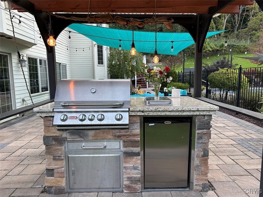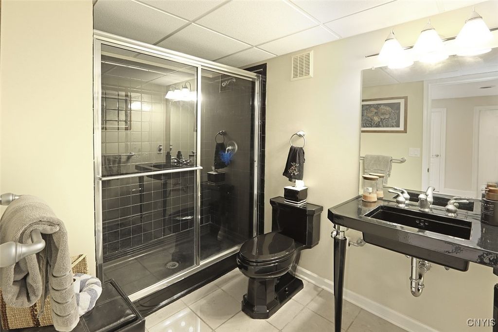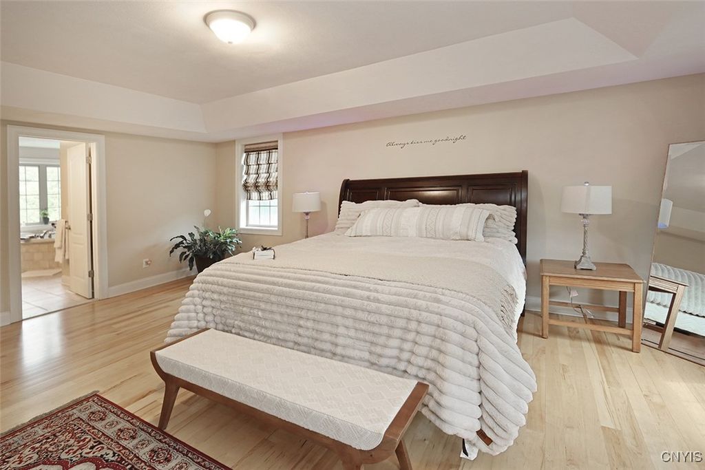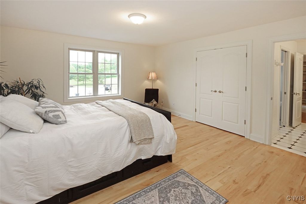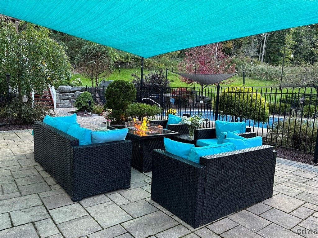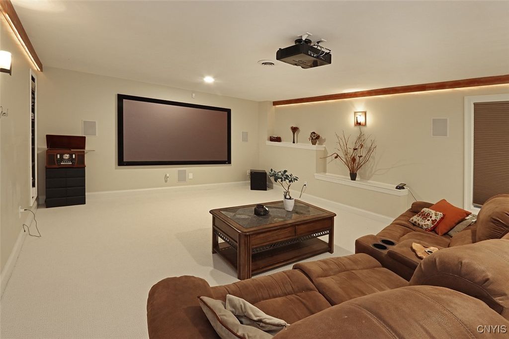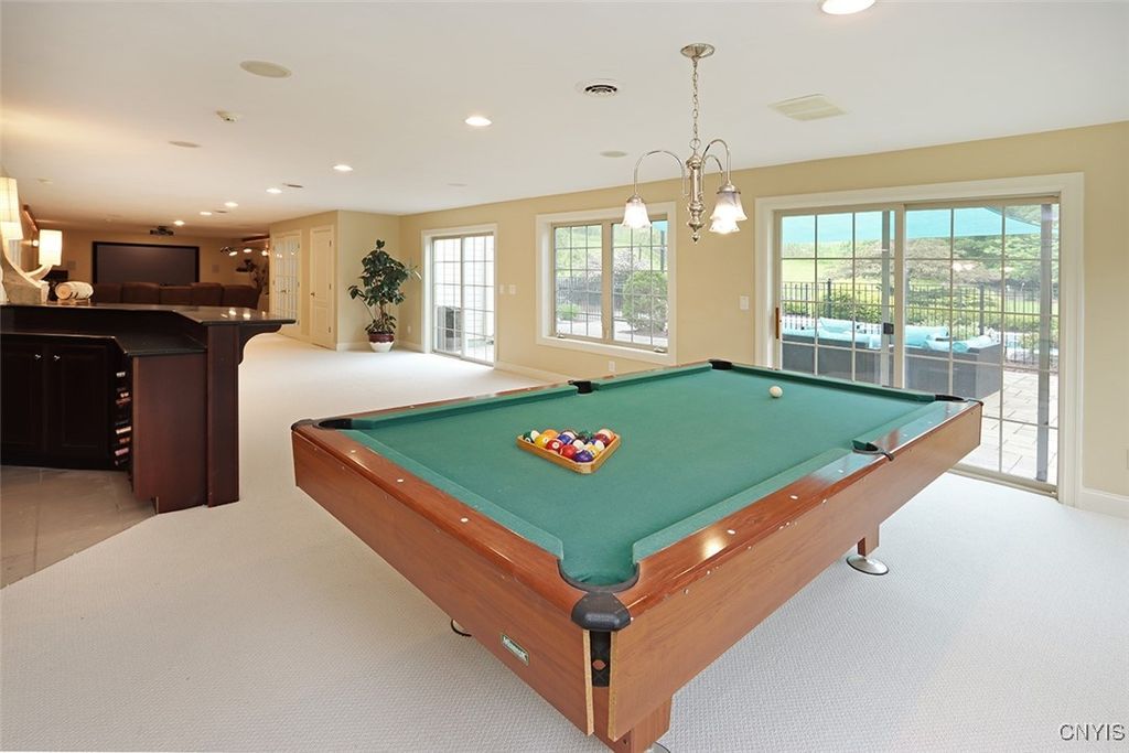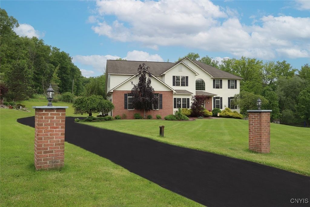 Expect to be impressed with this custom Colonial tucked at the end of a quiet cul-de-sac on 1.8 acres of beautifully landscaped grounds. The striking two-story foyer welcomes you with marble floors, a sweeping staircase and a stunning imported Asfour crystal chandelier. Gleaming hardwood floors, crown molding and bespoke millwork throughout create an atmosphere of refined elegance. A spacious home office with custom built-ins offers the optimal remote work setting. The open living and dining areas are divided by elegant columns, creating an ideal space for hosting. The living room features one of two gas fireplaces with a custom marble mantle, while the formal dining room is enhanced by wainscoting and a tray ceiling. The gourmet kitchen boasts a 10x5 granite island with breakfast bar, solid cherry cabinetry, GE Monogram stainless appliances, double ovens, dual dishwashers, walk-in pantry and casual dining area. The adjacent family room features a second fireplace, built-in media center, vaulted ceiling, slider to the back deck and a secondary staircase. Two powder rooms and a mudroom complete this level. Upstairs are four bedrooms, including the expansive primary suite with a generous walk-in closet and spa-like ensuite. Two bedrooms share a Jack-and-Jill bath and the fourth has a private bath. A convenient laundry center rounds out this floor. The finished walkout lower level adds 900 sq ft (included in total) and offers a full wet bar with wine rack, granite counters, fridge, dishwasher and ice maker"”perfect for entertaining. A custom home theater with built-ins sets the stage for movie nights and a bonus room plus full bath add even more versatility. Outside, enjoy a backyard oasis with an inground saltwater pool, expansive patio and a stone-faced outdoor kitchen"”fitting for summer gatherings. An upper deck overlooks the landscaped, tree-lined yard. Additional features include a whole-house security system, indoor/outdoor surround sound, lighted water feature and a large shed. Just minutes to Manlius Village, schools, shops and highways, this distinctive property showcases a refined blend of luxury, comfort and thoughtful design. Award-winning FM Schools!