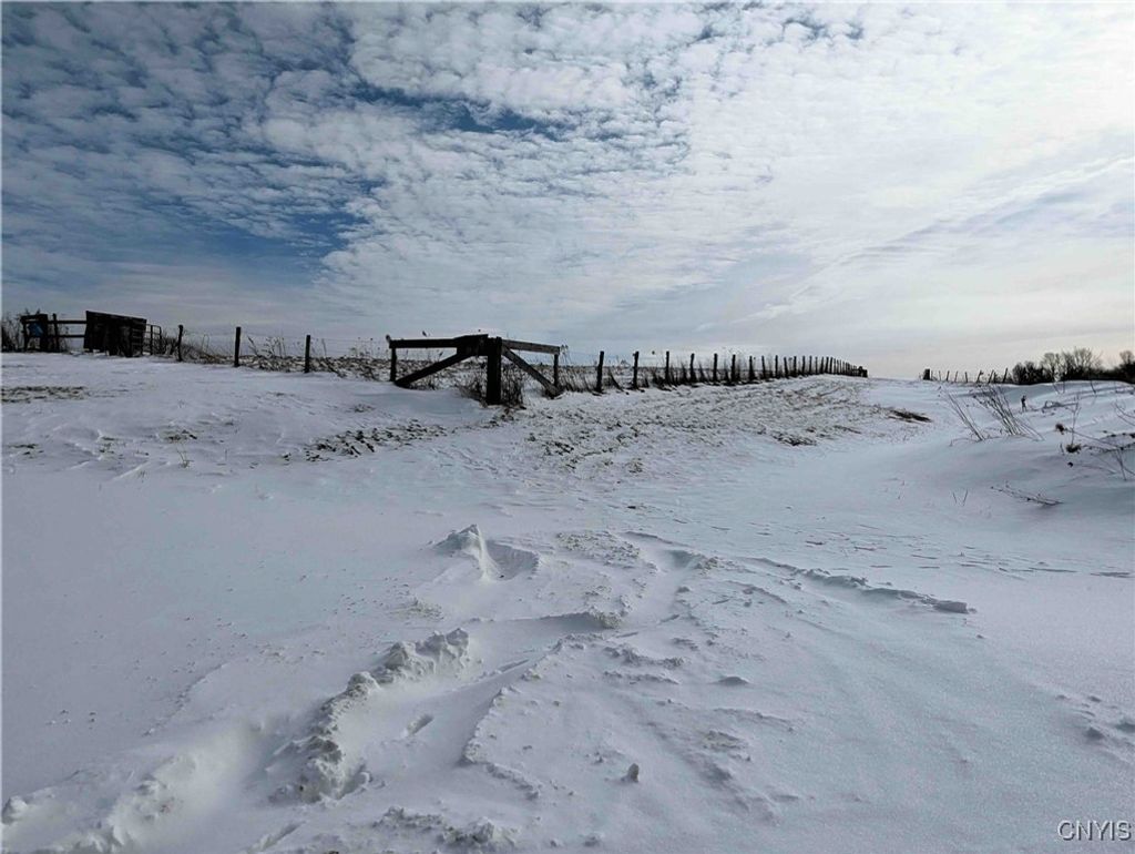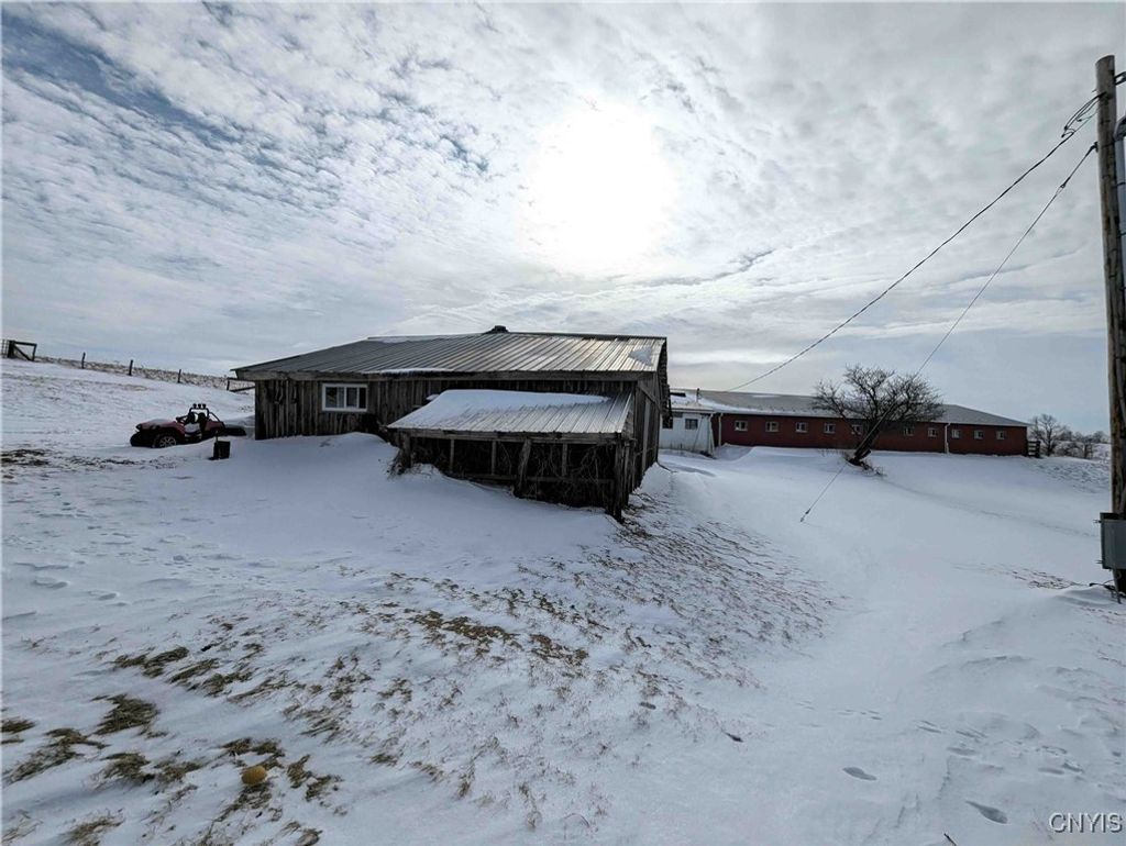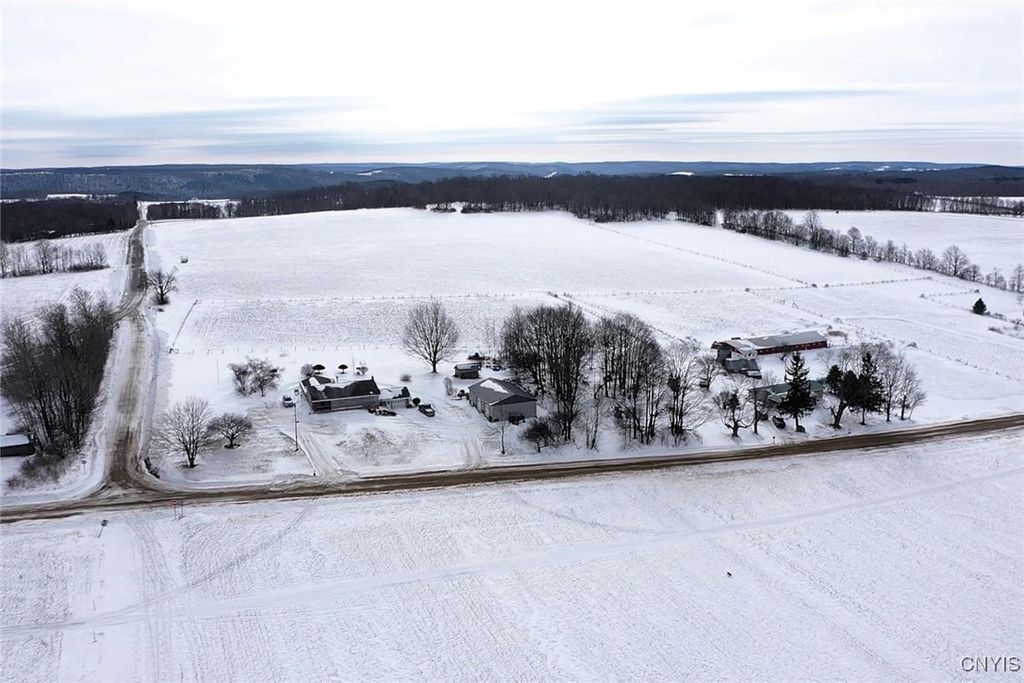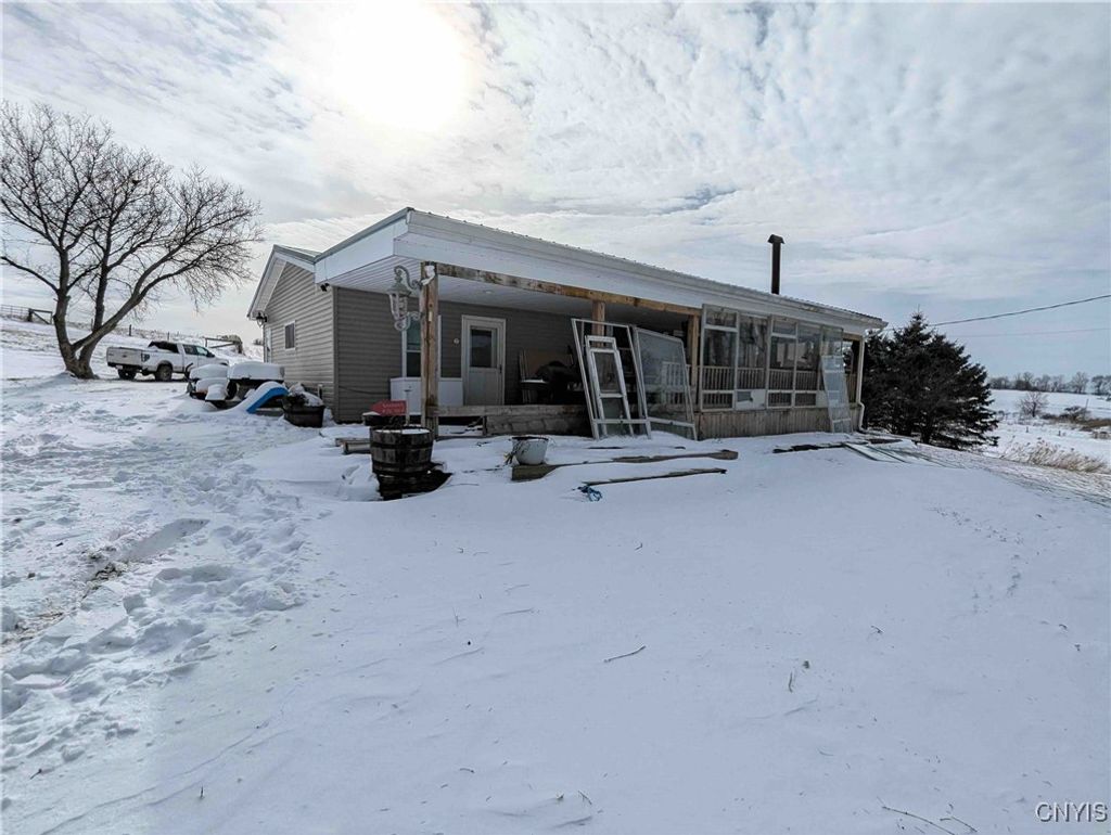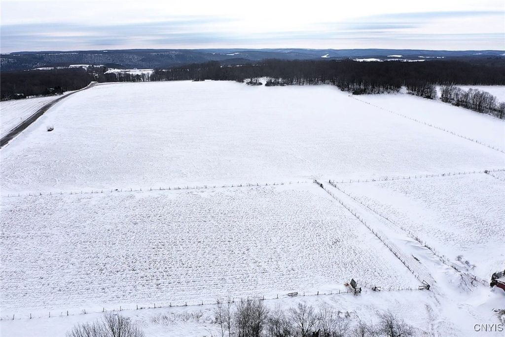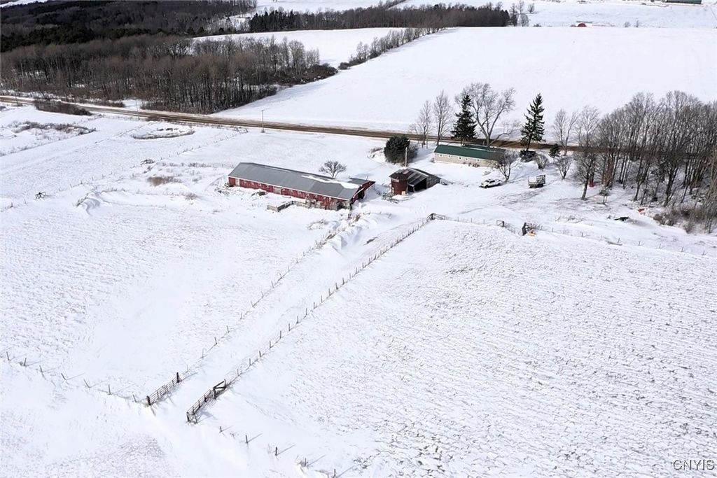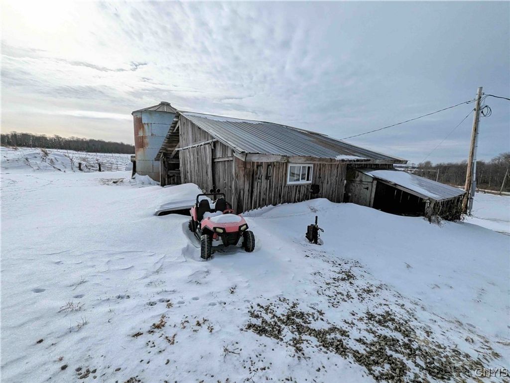 This country property consists of a home, large barn, farm fields, and woods on 75 acres located in Wellsville NY, Allegany County. Situated in the Town of Independence, this 3-bedroom, 1 bath ranch home offers a peaceful country setting along a quiet gravel road surrounded by sprawling farmland. Step onto the covered front porch and into a living room that seamlessly flows into an updated kitchen. A separate entrance at the end of the home leads to a spacious mudroom with additional storage. Hardwood floors extend through much of the first floor, complementing a full bathroom for added convenience. Downstairs, a full basement provides laundry hookups and ample storage space. Behind the home is a large 132 x 36 barn once used for milking cows that has been partially enclosed and converted into a functional workshop with running water and electricity. The west end of the barn remains equipped for livestock with headgates and six acres of fenced pasture. The remaining acreage consists of large, level farm fields and over 20 acres of timberland. With 4,200 feet of frontage on two roads and a prime rural location just off the paved road, this property presents an excellent opportunity to establish your own farm or enjoy a tranquil country lifestyle. All seller-owned rights will be conveyed to the new owner. Don't miss this rare chance to own a piece of beautiful countryside!