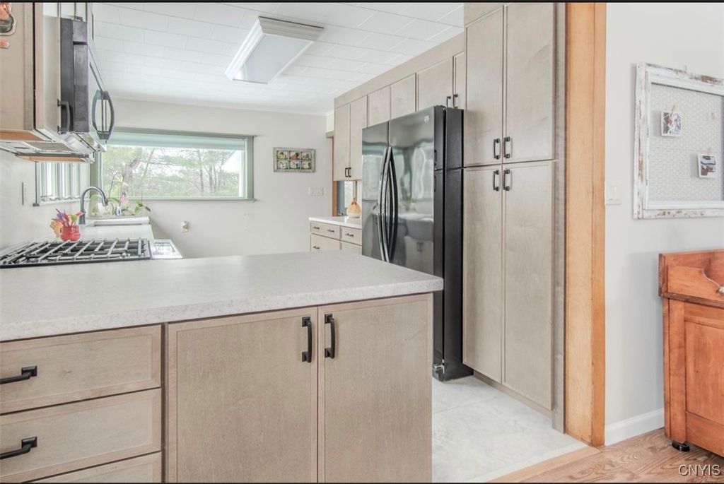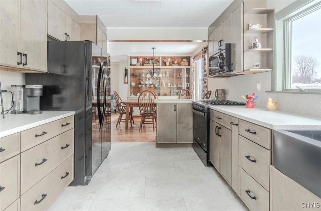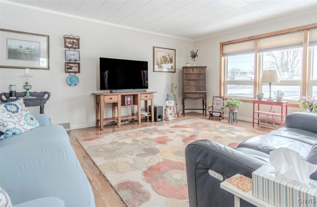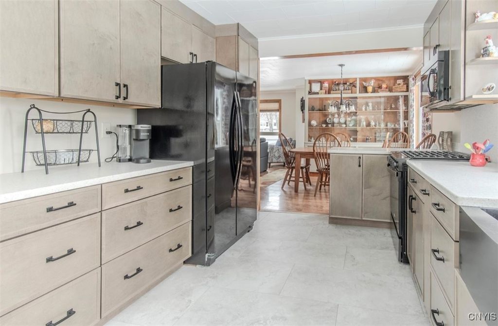 Comfortable and cozy is what any buyer will feel once they step inside the front door of this incredible ranch!! Owners have taken such amazing care of this timeless treasure and it certainly shows!! Large and inviting living room with floor to ceiling windows provide such warmth in the winter. Formal dining with built in glass hutch gives you the space you need for dishes and heirlooms. Beautiful new kitchen 2025 with modern cabinetry, solid surface counters and newer appliances. Primary bedroom affords the luxury of a king size bed if one chooses, cozy carpet and double closets. 2 additional bedrooms with a beautiful newer bath, double vanities all in mint condition. Full basement provides an exercise room, laundry room, workshop as well as an additional room for recreation/tv. 1 car garage with attached shed connects to the enclosed porch. Perfect for storage or summer sitting. Beautiful peaceful backyard with wildlife, many lovely perennials, stone sidewalk and more. Close commute to Ft Drum. shopping and the city of Watertown. Seller is providing a one year home warranty on the property to that new owner at time of settlememt.