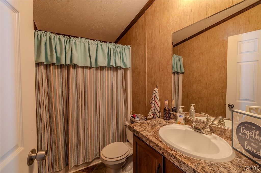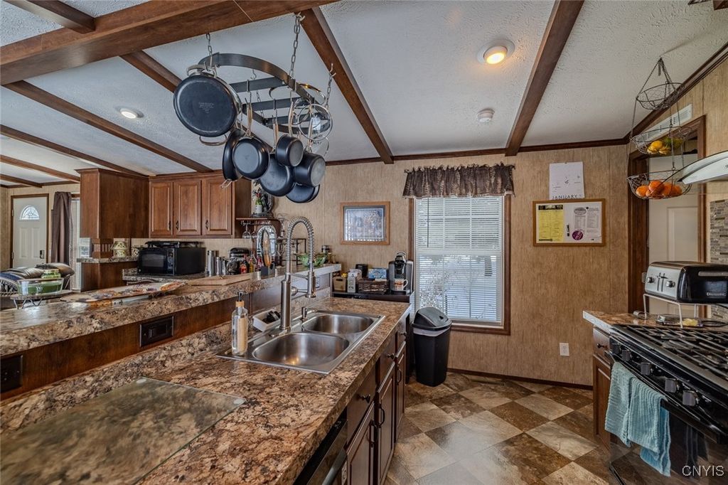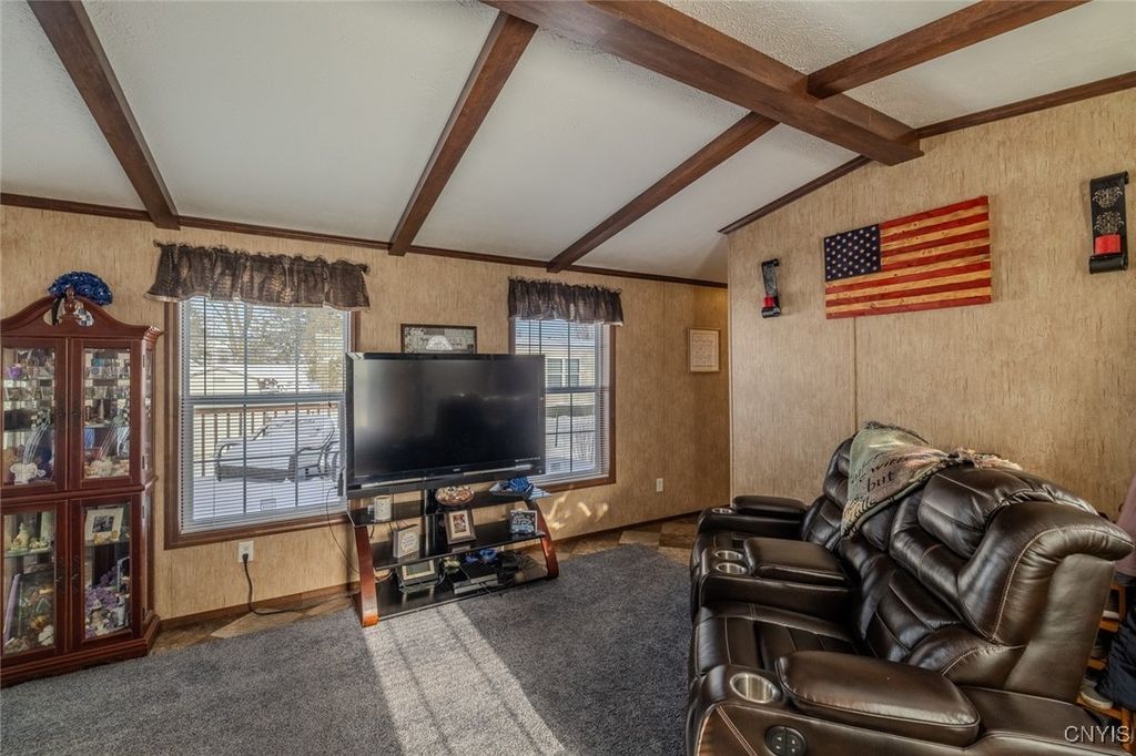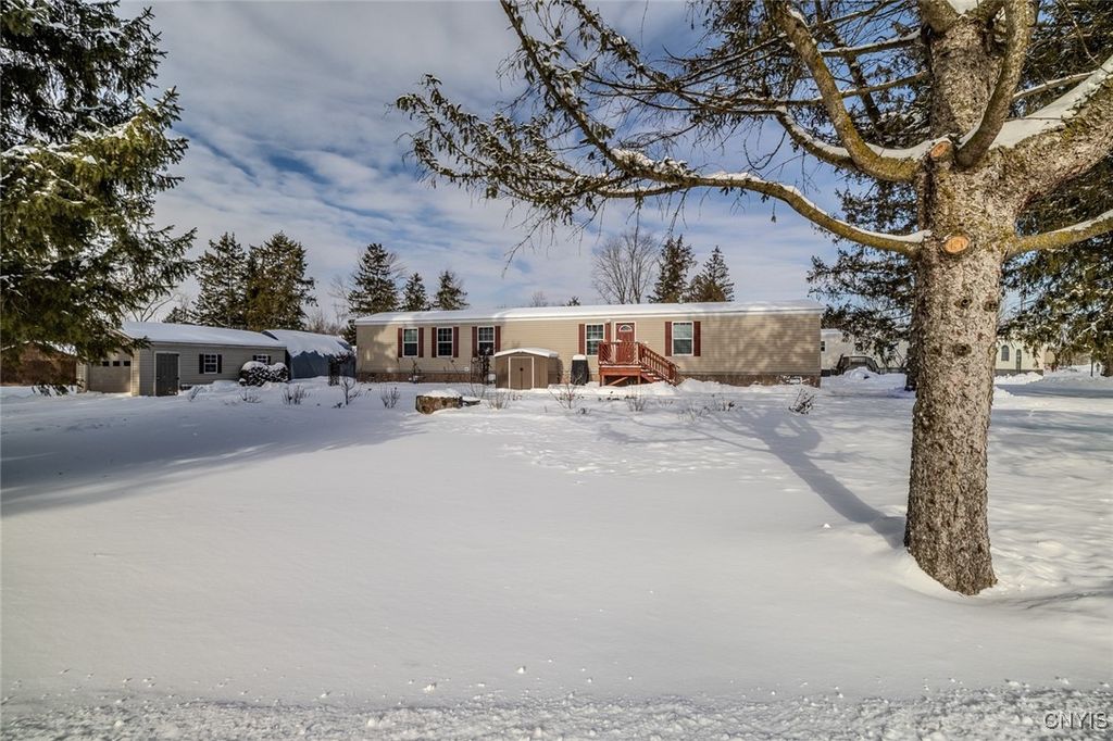 This 3-bedroom, 2-bath mobile home offers a comfortable layout and some great extras. Set on a large lot, the property features established landscaping, including black raspberry bushes, lilacs, hydrangeas, rose bushes, lavender, dogwood, and Rose of Sharon, adding beauty and variety to the outdoor space. A half circular driveway provides plenty of parking, along with a garage for storage, hobbies, or tools. Two sheds"”one located directly behind the garage and another positioned in front of the home"”offer additional convenient storage. Inside, the open kitchen and living area feel bright and welcoming, making it easy to relax or entertain. Central air provides consistent comfort throughout the seasons. A sliding glass door leads directly to the deck and hot tub, creating an easy indoor-outdoor flow"”perfect for winding down at the end of the day. Plus, being close to the Thruway makes getting around simple and convenient. A solid, low-maintenance home with features that make everyday living easy.