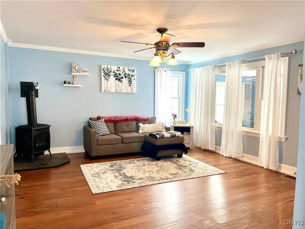 Charming and very well maintained 3 bedroom 2 full bath home with detached 2 car garage in the city of Oswego! This home offers 1,495 sq ft of inviting space to enjoy and host family, friend gatherings. Spacious eat in kitchen with breakfast bar and beverage cooler leading to the formal dining room with hardwood floors, or use as a sitting room, second living room. Large family room with a cozy gas fireplace leading to first floor full bath and 3 season sunroom. First floor laundry for convenience. 3 bedrooms and second full bath upstairs. Plenty of closet and storage space throughout the home. Partial basement is dry for additional storage needs. Many updates throughout the home inside and out have already been done including newer windows, roofing, furnace, garage doors, flooring, updated kitchen and bathrooms. Some newer appliances. Electric panel has been updated and basement has been waterproofed with updated french drain. Outside you can enjoy the covered front porch with double glider chairs or the sizable and private back deck with pergola on nice weather days. 2 car garage to park your vehicles out of the weather with space for a workshop area. This home is ready to move in and enjoy!